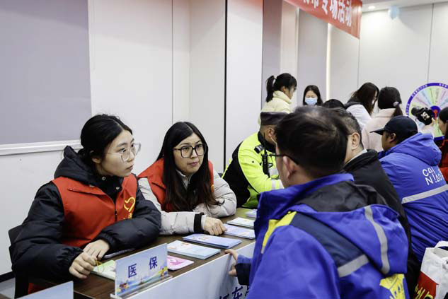 人社、医保、卫健、公安等多部门设立的政策咨询区前人头攒动,除了面对面讲解养老医保报销、冬季交通安全、“反家暴”维权等知识,现场还设置了“安全知识转盘”等趣味活动,吸引新就业群体积极参与。