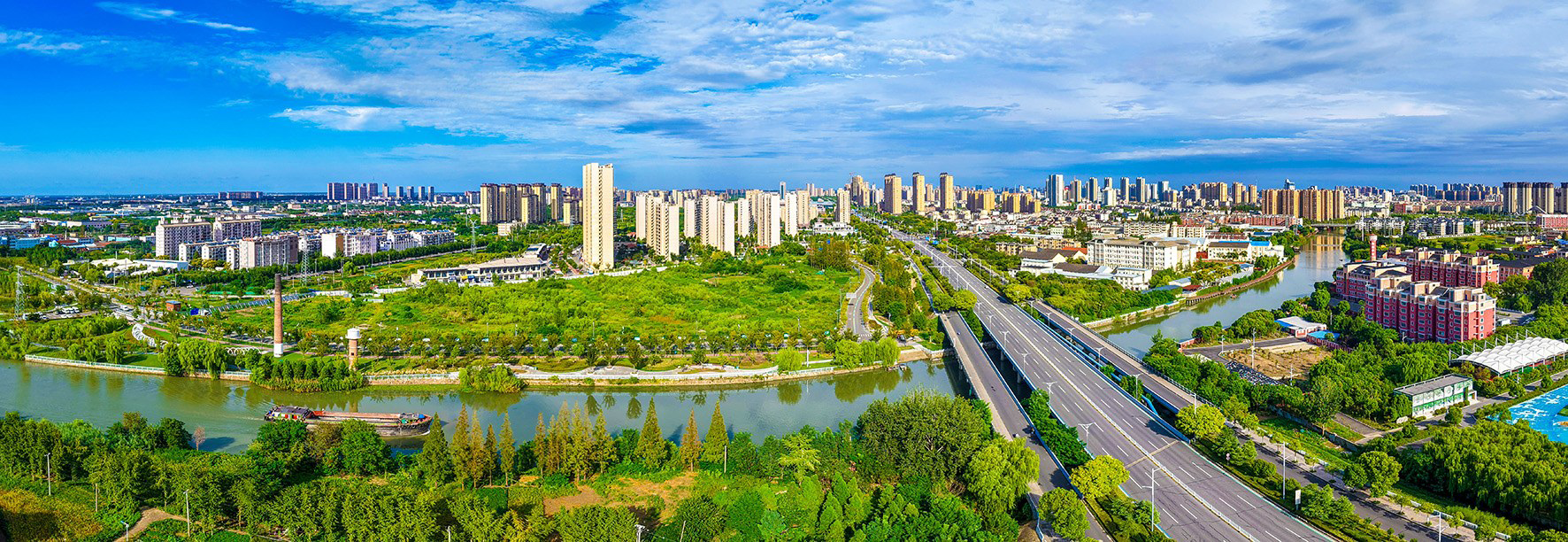 宁海大桥如一条银色的纽带,横跨河面。河畔绿树成荫,与远处错落的高楼、大片绿地相映成趣。现代化建筑与自然生态和谐共生,勾勒出东台宜居宜业的城市新貌,尽显发展与生态兼顾的活力图景。
