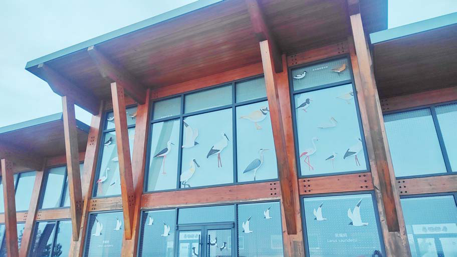 10月26日,完成防鸟撞改造后的条子泥湿地四号驿站,周边的玻璃表面粘贴的白色波点贴纸,能够帮助鸟类清晰识别障碍物。参与改造的北京林业大学青年志愿者团队选取多种具有代表性、体型各异的水鸟,以“排排站”的趣味图案呈现贴纸样式,既有效发挥防鸟撞功能,又通过生动的视觉设计实现科普教育与空间美化的双重效果。