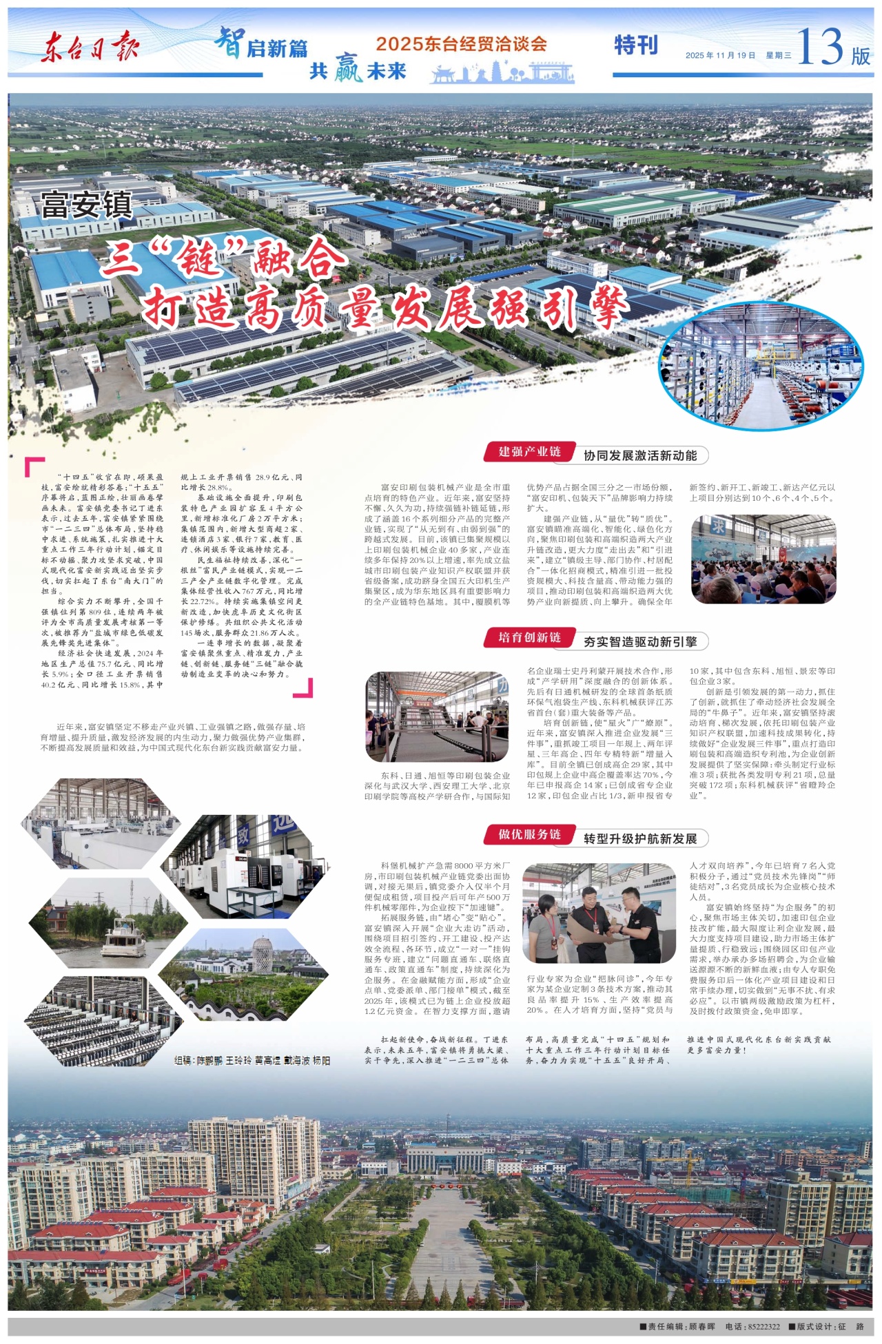 富安印刷包装机械产业是全市重点培育的特色产业。近年来,富安坚持不懈、久久为功,持续强链补链延链,形成了涵盖16个系列细分产品的完整产业链,实现了“从无到有、由弱到强”的跨越式发展。目前,该镇已集聚规模以上印刷包装机械企业40多家,产业连续多年保持20%以上增速,率先成立盐城市印刷包装产业知识产权联盟并获省级备案,成功跻身全国五大印机生产集聚区,成为华东地区具有重要影响力的全产业链特色基地。其中,覆膜机等优势产品占据全国三分之一市场份额,“富安印机、包装天下”品牌影响力持续扩大。