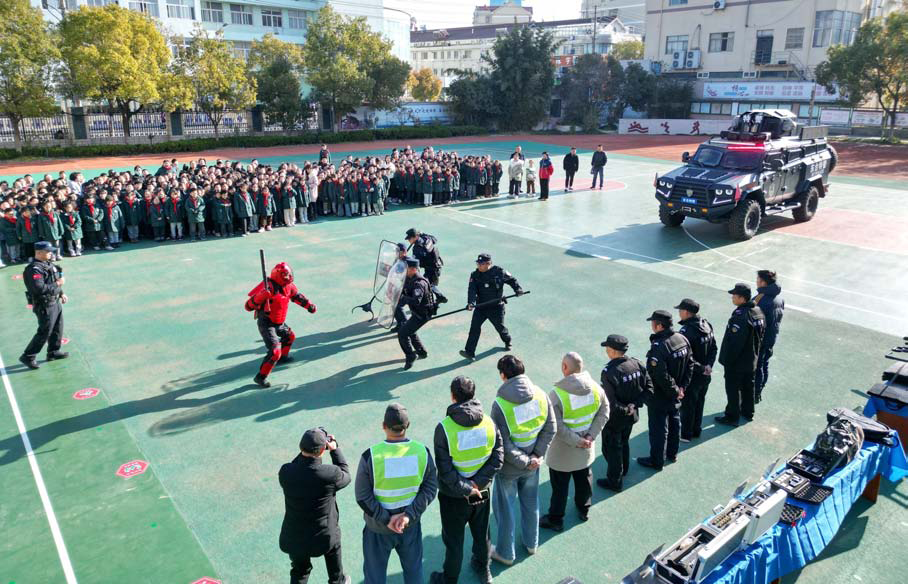 近日,市公安局巡特警大队联合新坝派出所,赴辖区市实验小学启平分校指导开展预防暴力伤害应急演练。活动中,警方同步普及多种新型警用装备的功能及应用场景,有效提升校园突发事件的处置应变能力与师生避险自救技能。练益华 摄