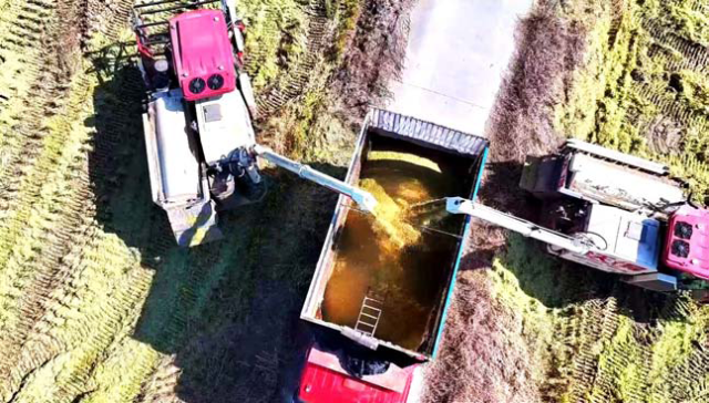 数台收割机轰鸣着穿梭在田垄间,摘穗、脱粒、秸秆粉碎作业一气呵成,饱满的稻谷顺着输送管源源不断涌入机身;田埂边,等候的运输车辆有序停靠,收割机满仓后便立即对接卸粮,将新鲜稻谷及时转运,确保颗粒归仓。