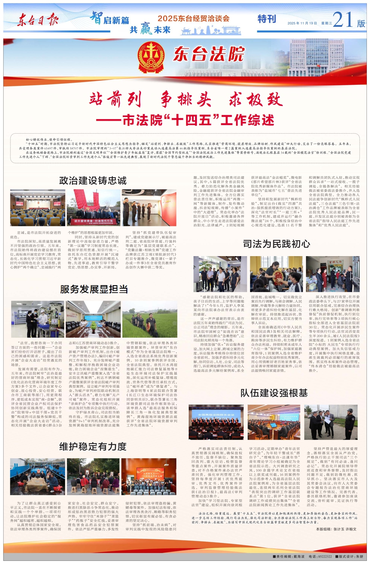 法治之路,任重道远。展望“十五五”,市法院将以更加饱满的热情,更加昂扬的姿态,更加务实的作风,进一步总结工作经验,践行司法为民,强化司法职能,全力推动法院工作再上新台阶,奋力实现各项工作“站前列、争排头、求极致”,为谱写中国式现代化东台新篇章贡献更多司法智慧和力量。本版组稿: 张计玉 许翰文