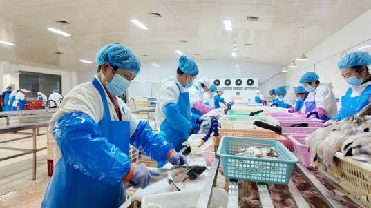当活虾销往国内市场的同时,另一批水产品正进入现代化车间,经历精深加工,准备远渡重洋。