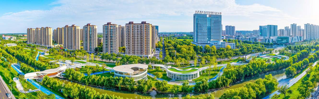 空中俯瞰,网界河波光粼粼,似丝带穿城而过。河畔柳树绿意盎然,枝条随风轻摆;两岸绿植错落、草地如茵,与现代化建筑相互映衬,绘就一幅城市生态美画卷。